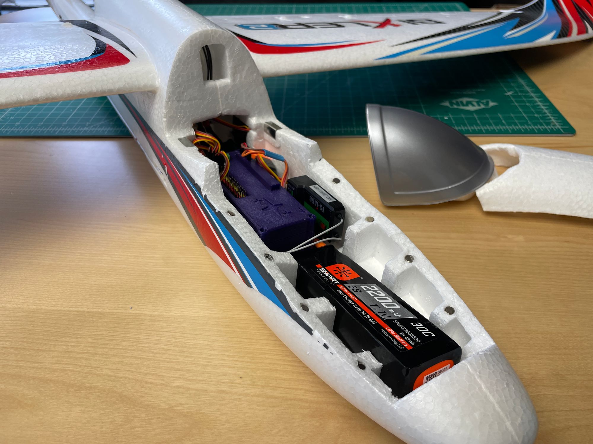 The fixed wing aircraft we're using is the popular Bixler 2. It's small enough to wrangle with one person, but large enough to resist light wind disturbances and fly easily. We carve out some foam in the nose to house our electronics (Raspberry Pi Zero, Serial Communication Hat and Servo Hat), which we've packaged into a custom 3d printed "black box" - except it's purple, and not indestructible.