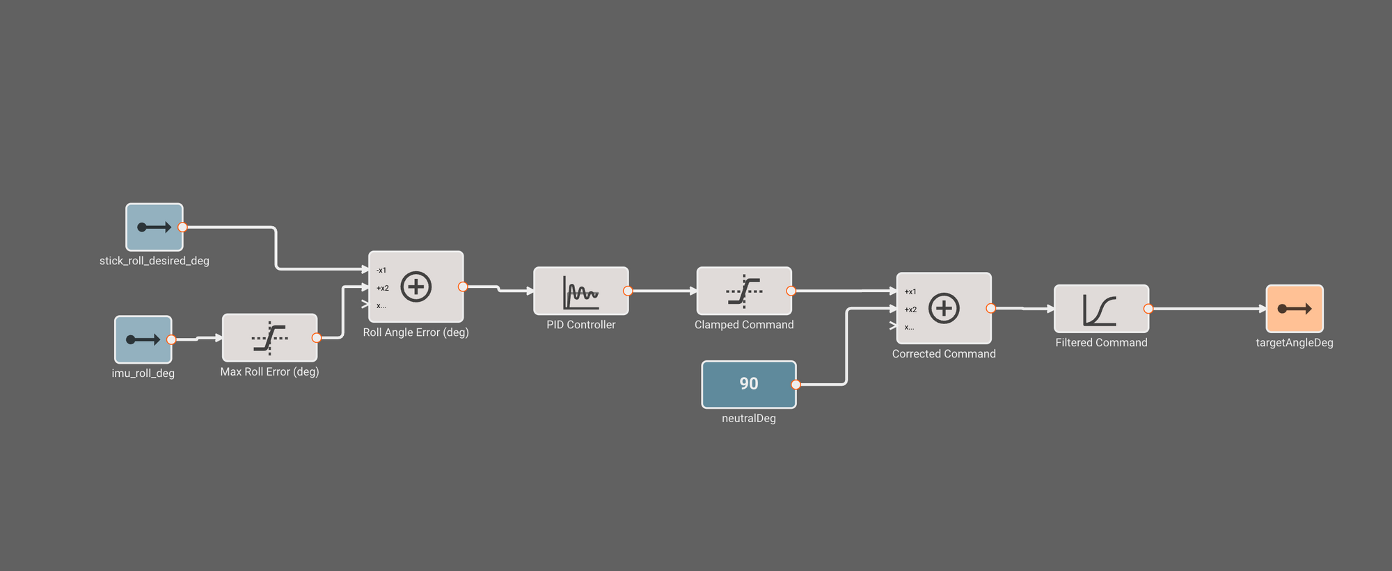 This error signal is propagated into a PID block, which we've tuned to give a nice stiff response without excessive overshoot. Just to be sure, we clamp the output command to the maximum possible deflection of our servos (45 degrees), which we then offset from the "neutral" stick position of 90 degrees. Finally, we apply some light filtering (IIR filter with time constant = 0.01s) on the final command to smooth noisy data. We pass this output to the servo driver block to issue commands over I2C.
