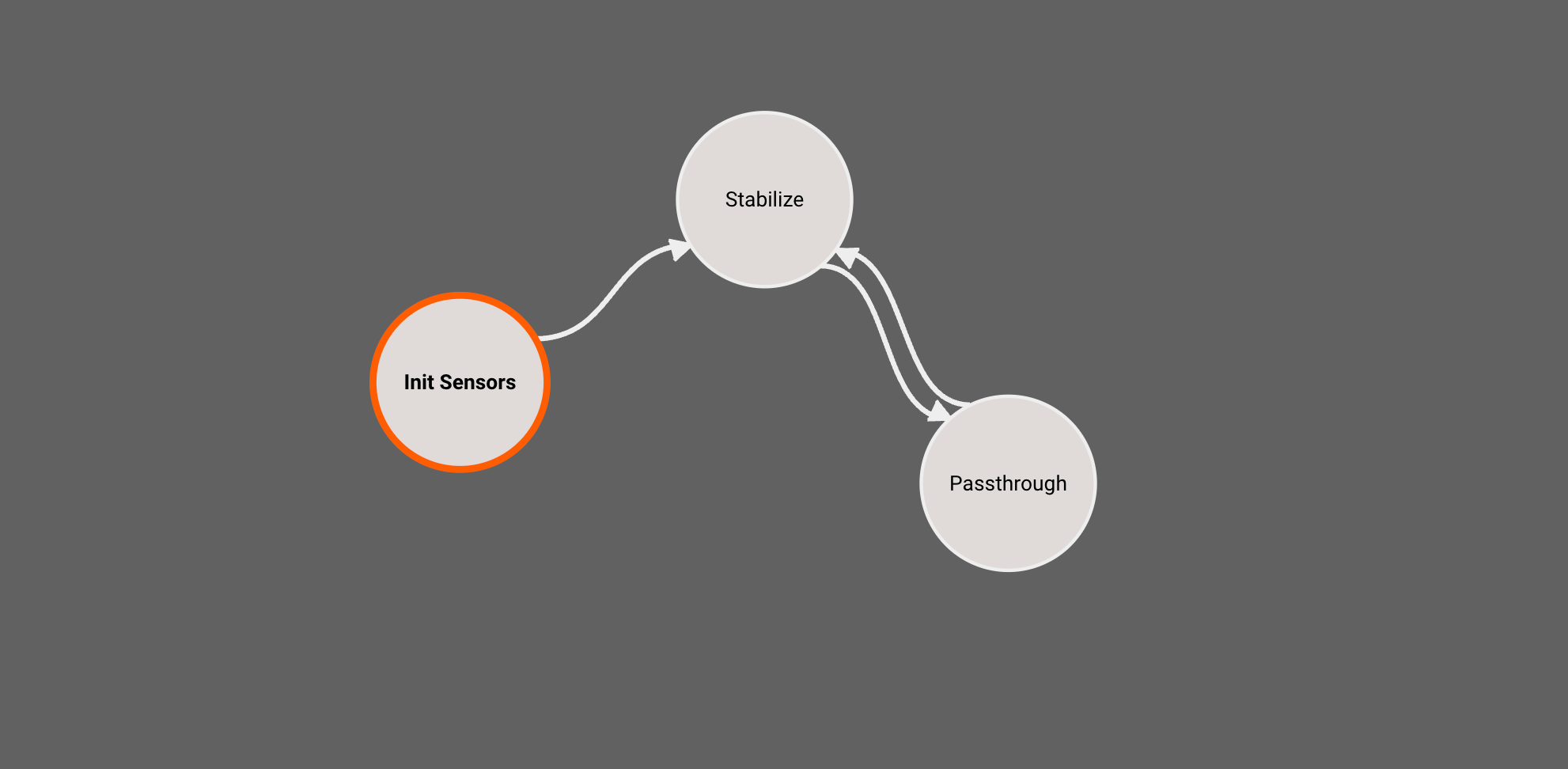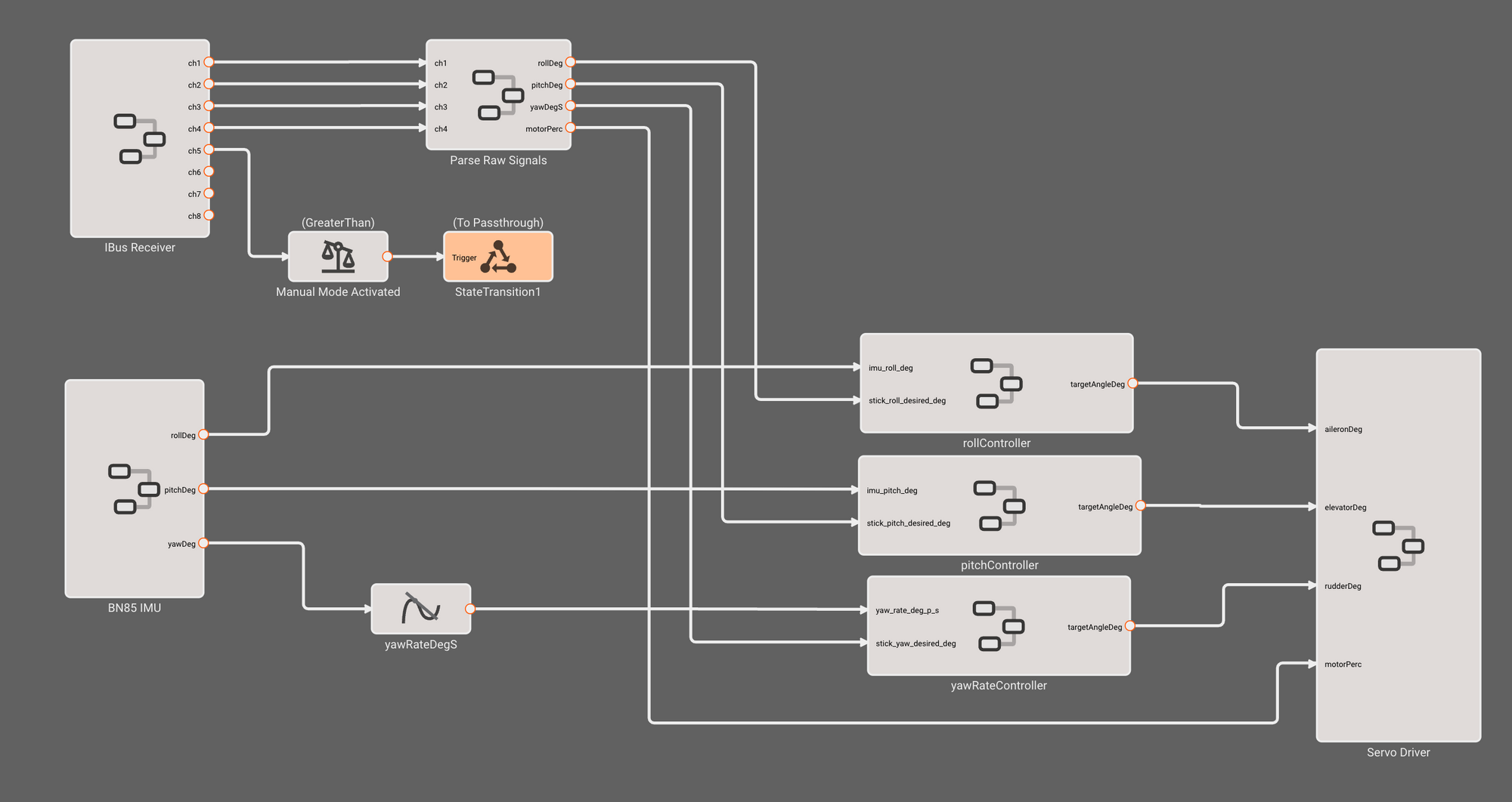 Our autopilot diagram resides in the Stabilize State, and Passthrough simply commands RC stick input directly to the servos. This gives us the same behavior as if our flight controller did not exist and the receiver was wired directly to servos.