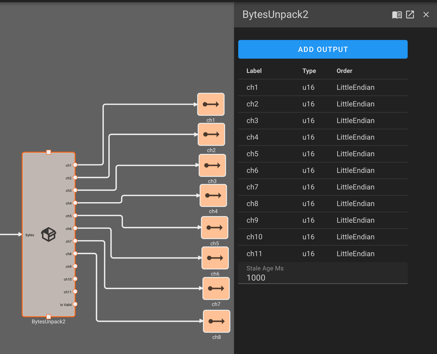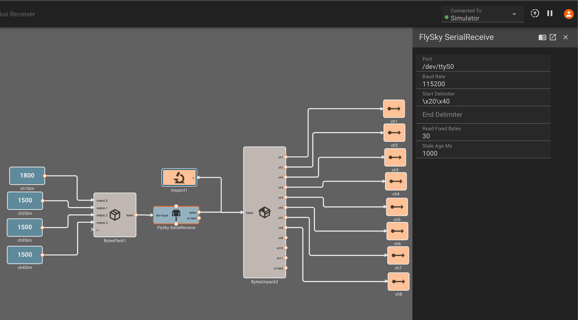For our BytesUnpack block, we specify the data type (unsigned 16-bit integers) and Endian-ness of the individual signals packed into each 30 byte block of data we read over serial. Each of these channels represents a different stick or switch on the FlySky transmitter.