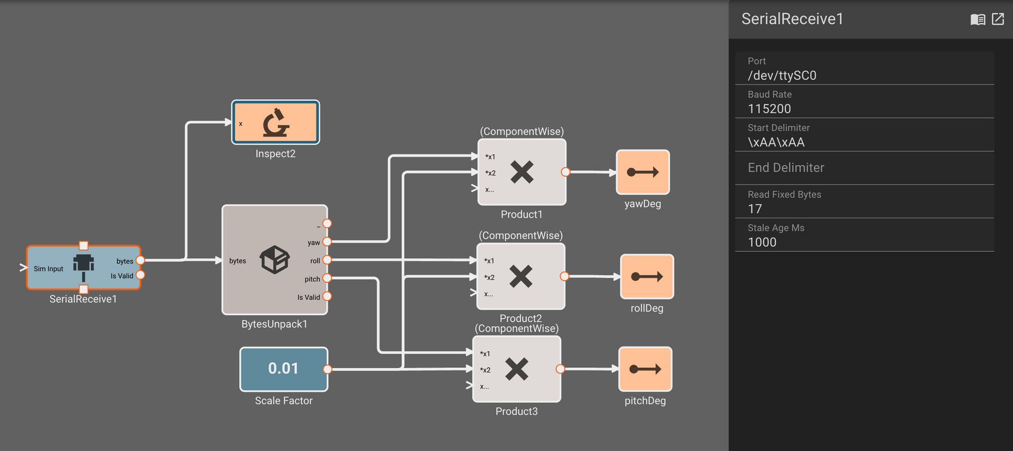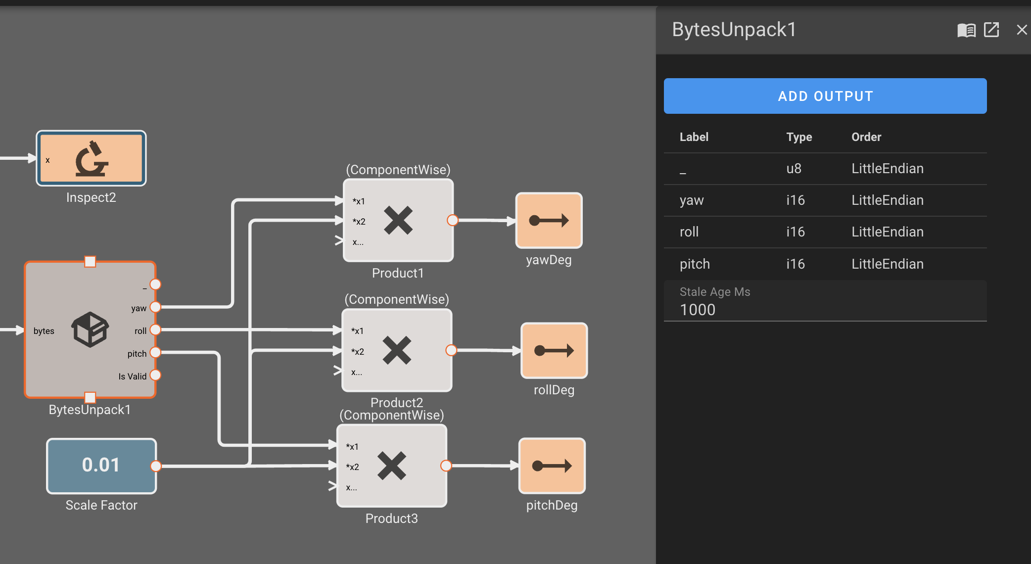 In our IMU ByteUnpack, we ignore the first u8 in the message, and then specify the signals we care about. Finally, we scale these integers by 0.01 to emit angles in floating point degrees: