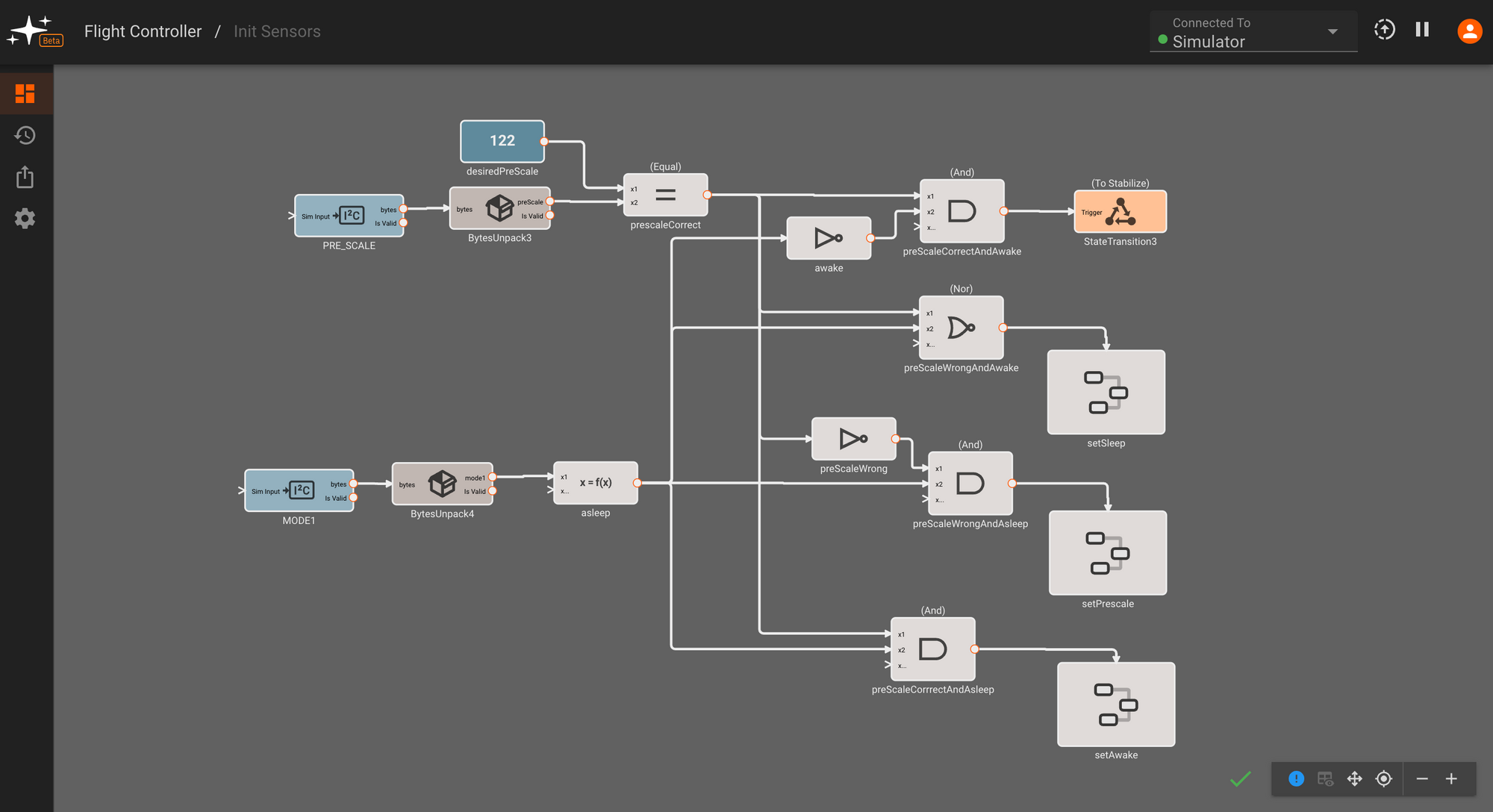 We want to be able to disable our autopilot for debugging purposes (or if our pilot is feeling sporty) with the flip of a switch on the RC, so we need to introduce a simple State Machine for our flight controller. Pictorus's State Machine workflow makes it easy to describe our States and their transitions graphically: