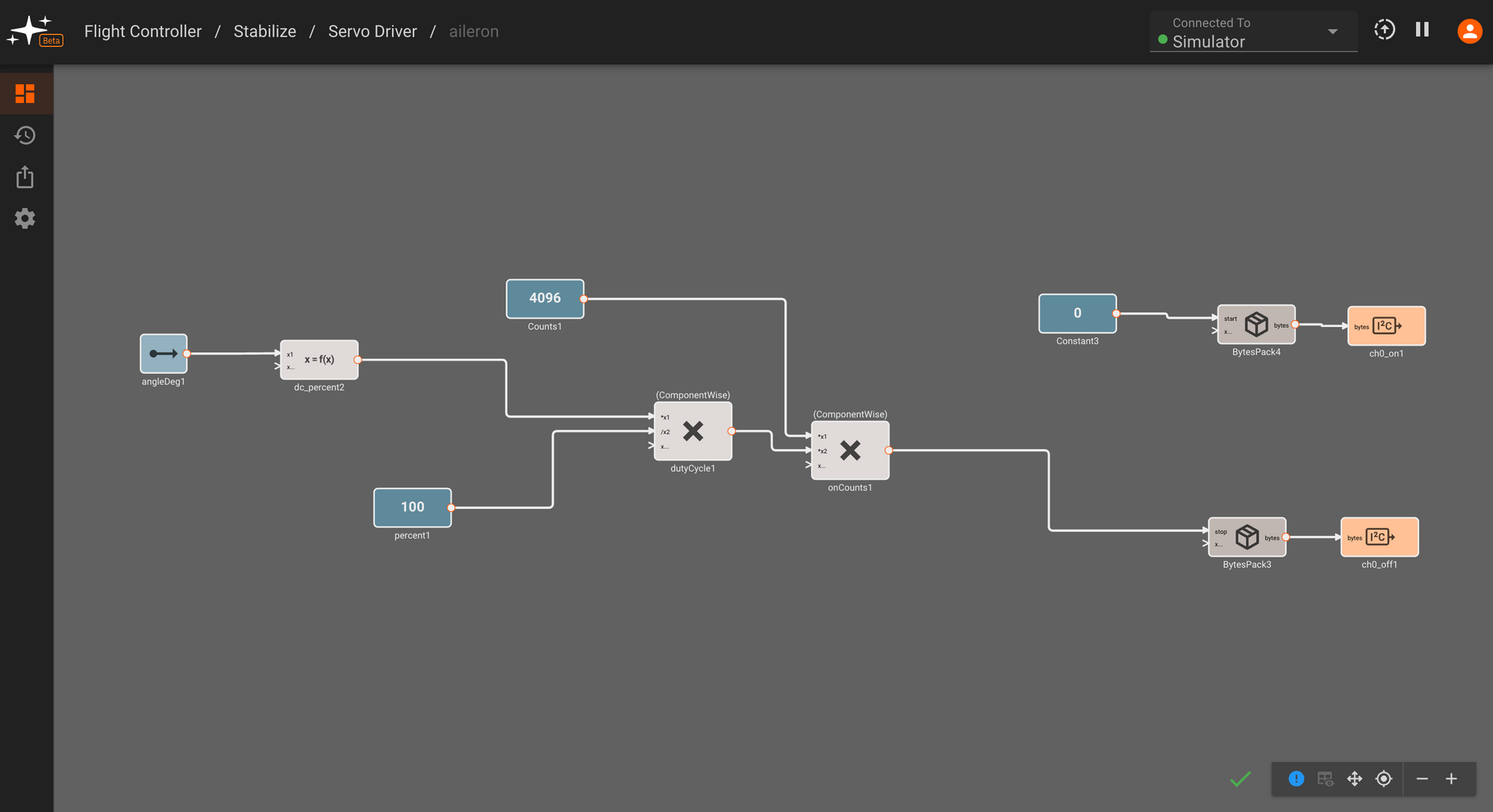 From our roll, pitch and yaw rate controller blocks covered in the previous section, we send individual target servo angles to servos attached to the plane's ailerons, elevator, and rudder. Within each servo driver component, we convert angles to PWM duty cycle, and then scale them to a value between 0-4096 to send to the right angle setting registered (again referencing the demo code for register values).