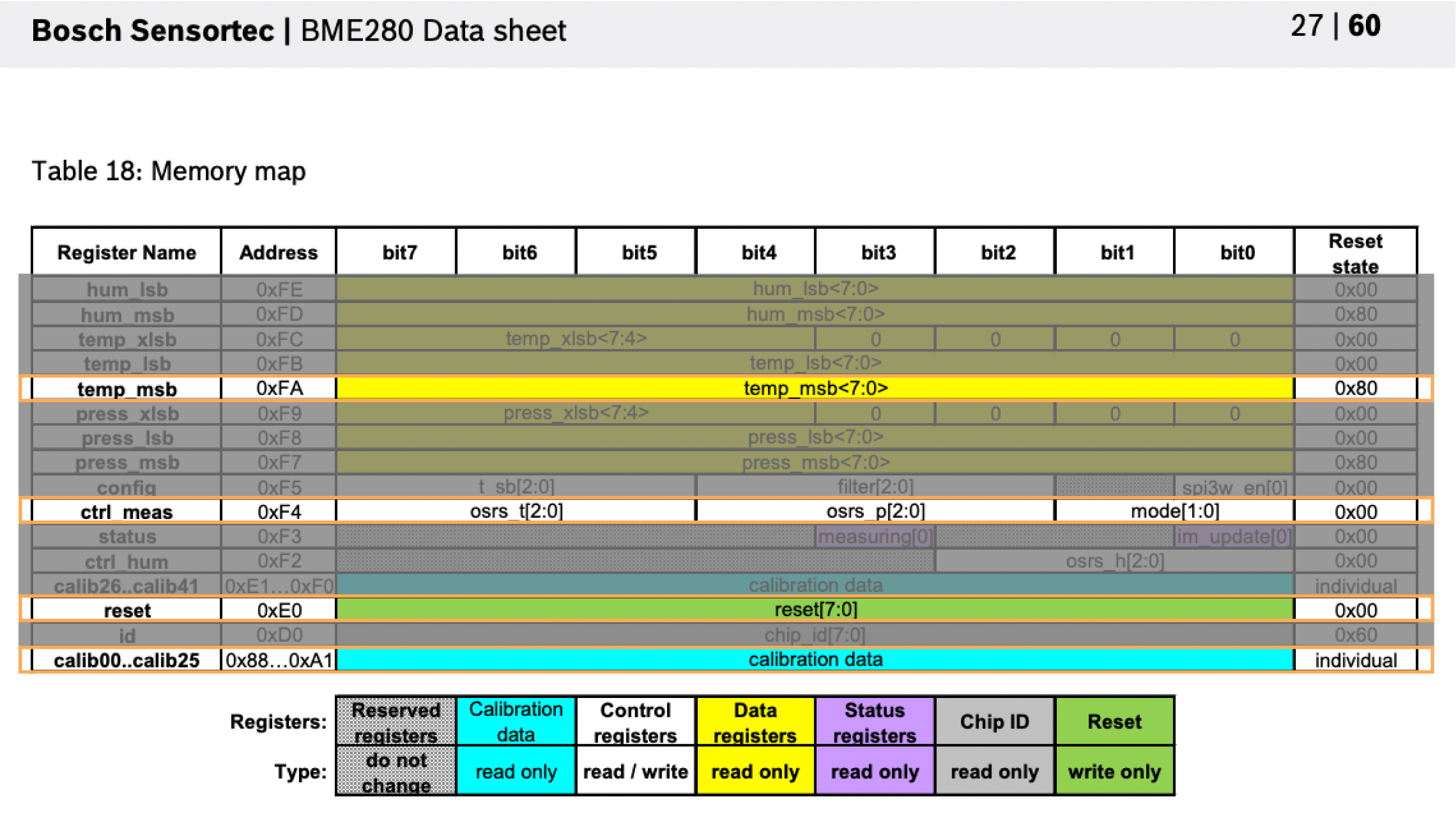 For temperature readings, the first step is a setup sequence that consists of sending a soft reset command to the sensor, setting the data read mode, and reading the sensor’s calibration coefficients. Relevant registers and constants can be found either in the “General Information” section of the referenced Python script or in Section 5 of the data sheet. We’ll be working with those highlighted in the data sheet below.