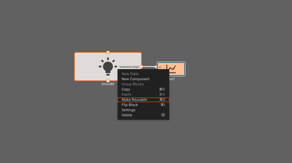 That wraps up the temperature sensing BME280 component build! In order to reuse the setup and math we just did, we can make the component reusable by right clicking on the component and selecting "Make Reusable."