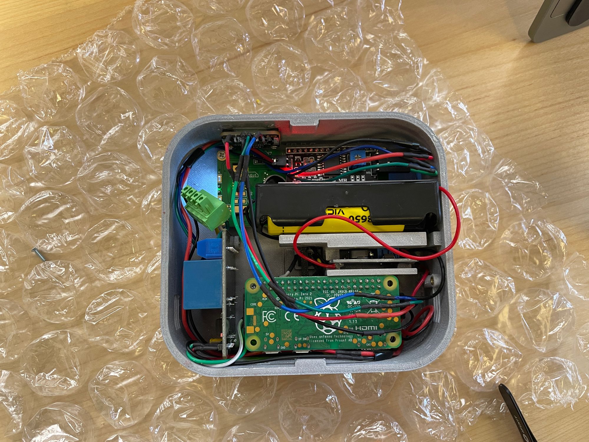 After soldering everything onto a protoboard - we used this stackable one for the Pi Zero - we can secure all components within the enclosure using heat set inserts and screws.
