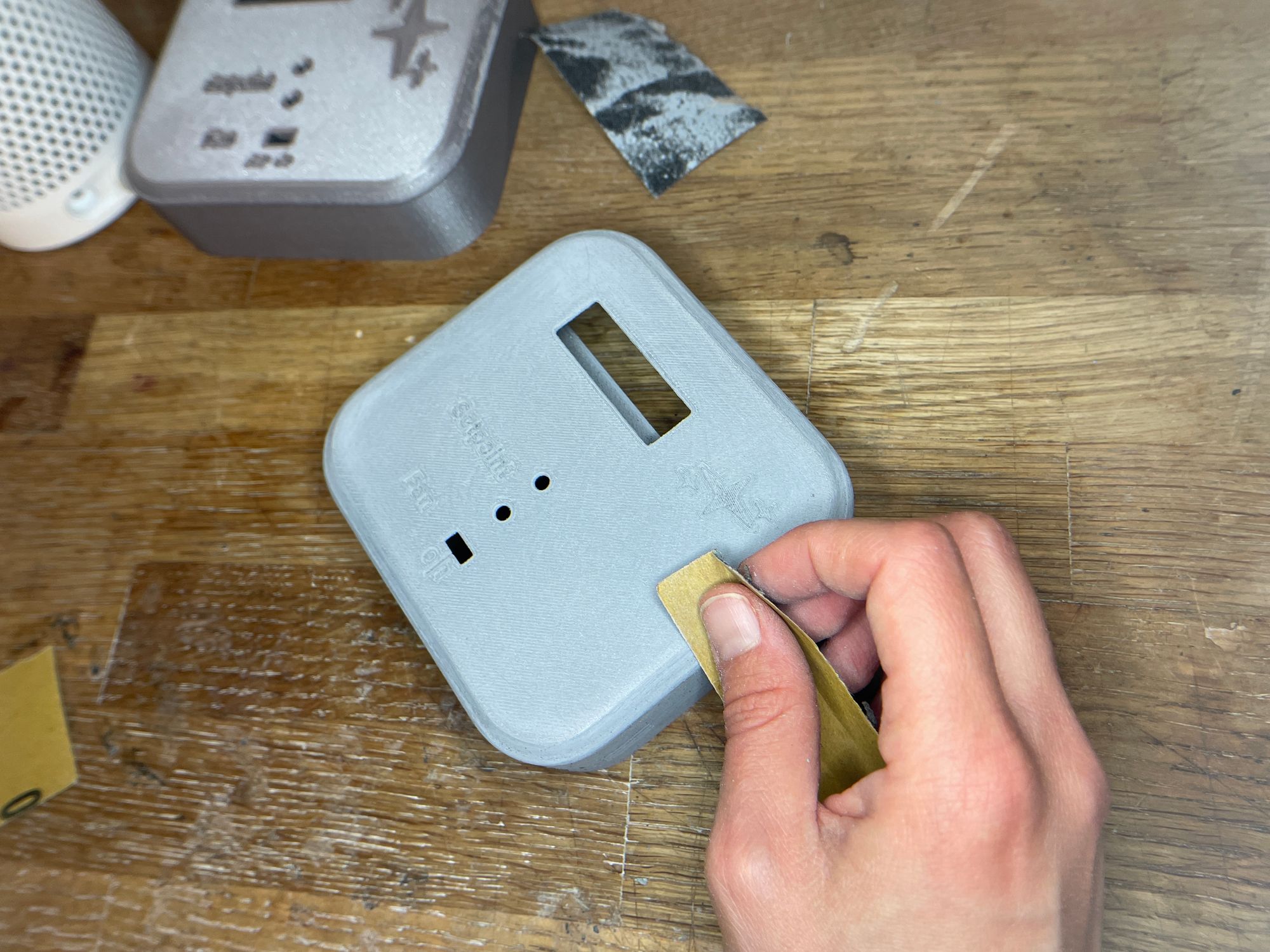Once the enclosure parts are printed, we finish the front face with a few cycles of sanding-priming-painting.