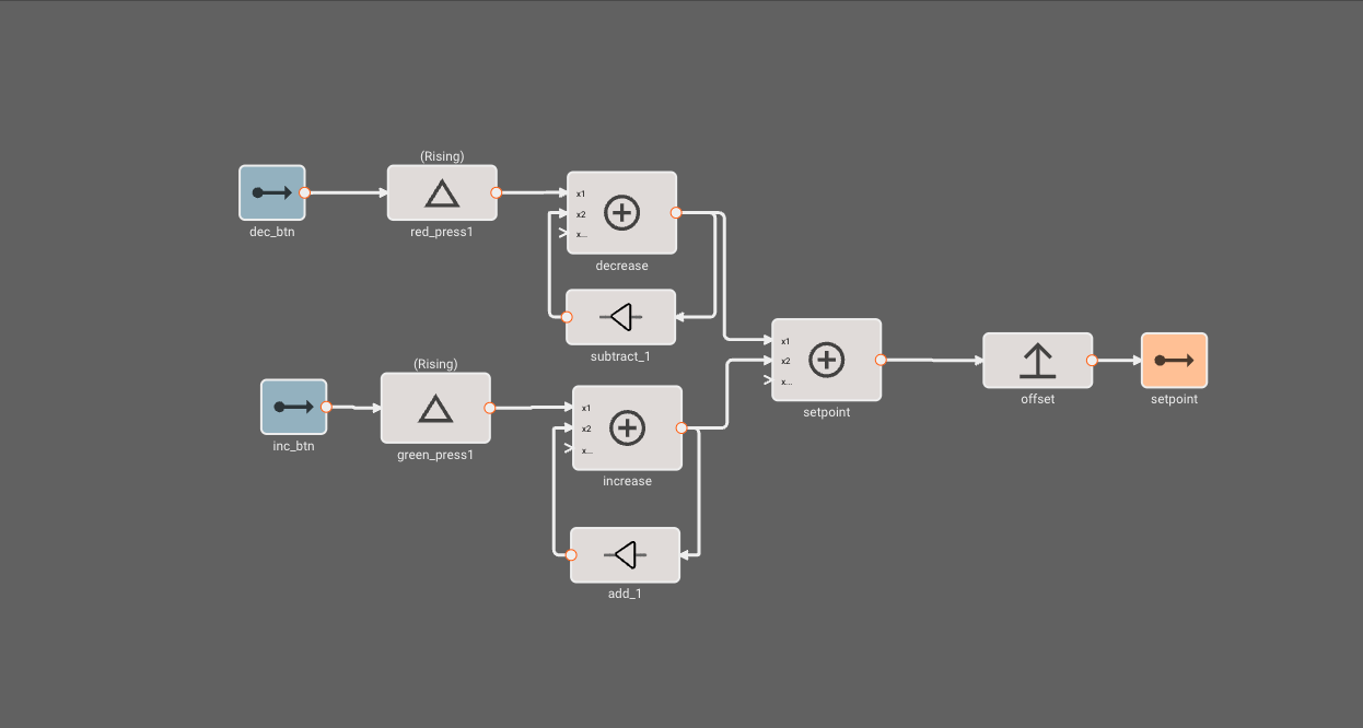 For step 2, we can build a simple up-down counter using a series of summing blocks and two gain blocks that allow for each button press to incrementally change a value. We also add an offset (of 68) to this value in order for the setpoint to start around an expected desired room temperature.