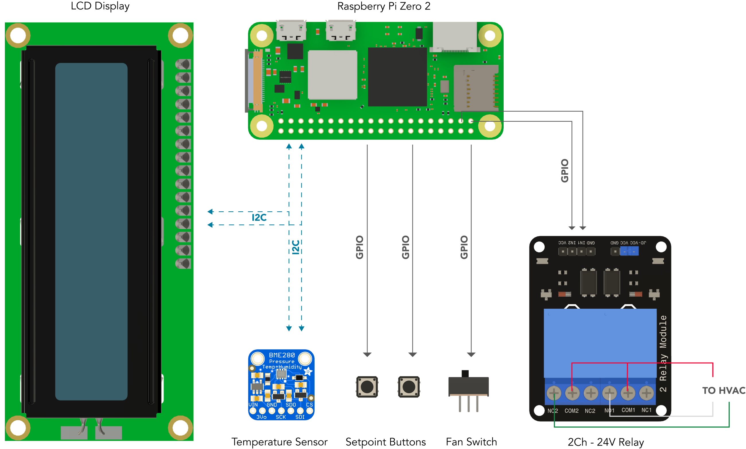 In order to switch the fan and heater on or off, we will utilize a 24V relay driven by a Raspberry Pi Zero (RPi). We chose this single-board computer since it packs most of the Raspberry Pi functionalities in a much lighter weight form factor, and is also commonly used in DIY Internet of Things (IoT) projects.