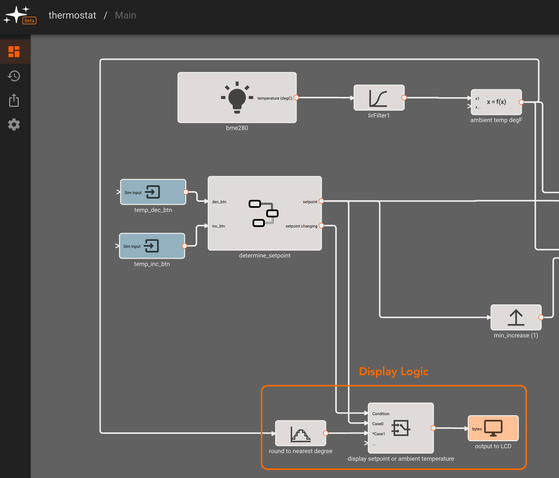 To toggle between displaying the currently sensed temperature we use a Switch block. In the case that the setpoint is being changed (with a buffer of 2s after a button pressed is detected), then we will display the current setpoint. Otherwise, we display the sensed temperature.