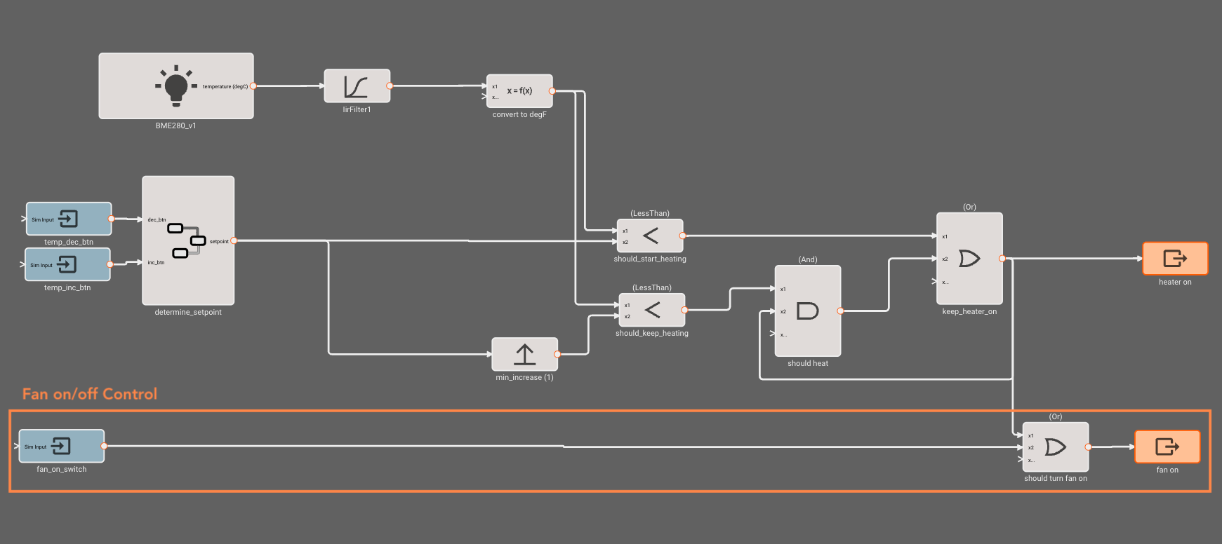 The last control we need to add - in step 4 - is a couple of blocks that turn the fan on when the switch is set to the “on” position (or when the heater is on).