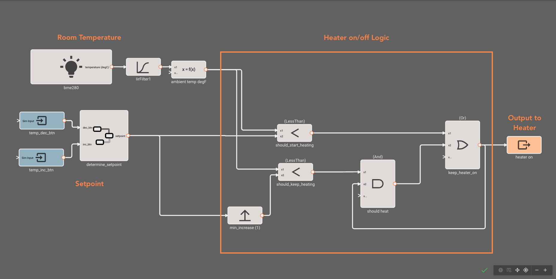 In step 3, we compare the temperature sensor readings to the desired temperature setpoint in order to turn the heater and fan on or off. The heater and fan (let’s call this “heat” for short) are turned on together in order for hot air to circulate throughout the space. The series of blocks below compare the current temperature to the desired setpoint, turning the heat on if the setpoint is lower than the setpoint and only turning it off after we have increased the room temperature by 1 degree.