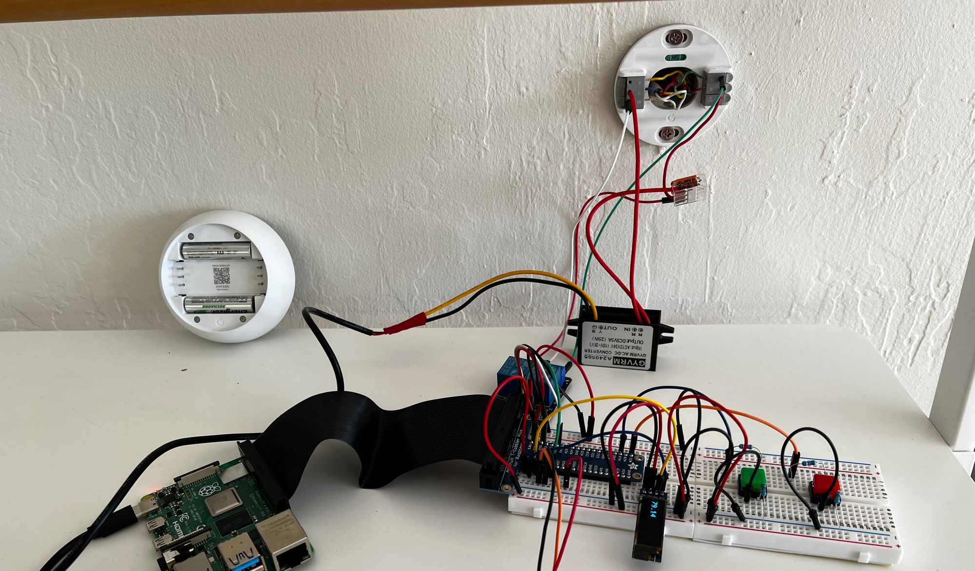 Before starting the assembly of our system, we can first check that our thermostat works as expected by mocking it up on a breadboard with jumper wires. This is also a good time to check that our interface with the wall thermostat wiring is as expected, before designing an enclosure. For this first functional test, we used a Raspberry Pi4.