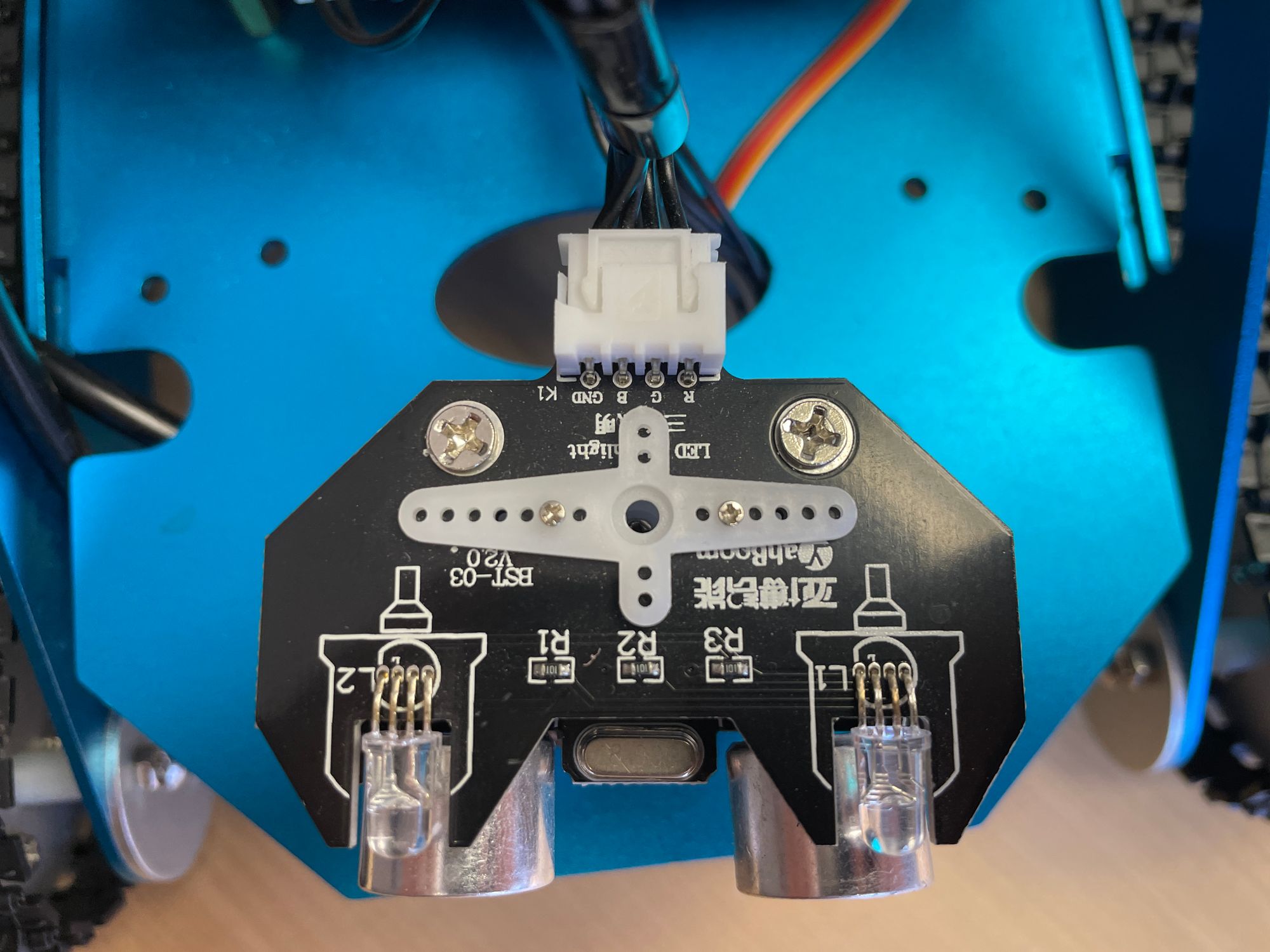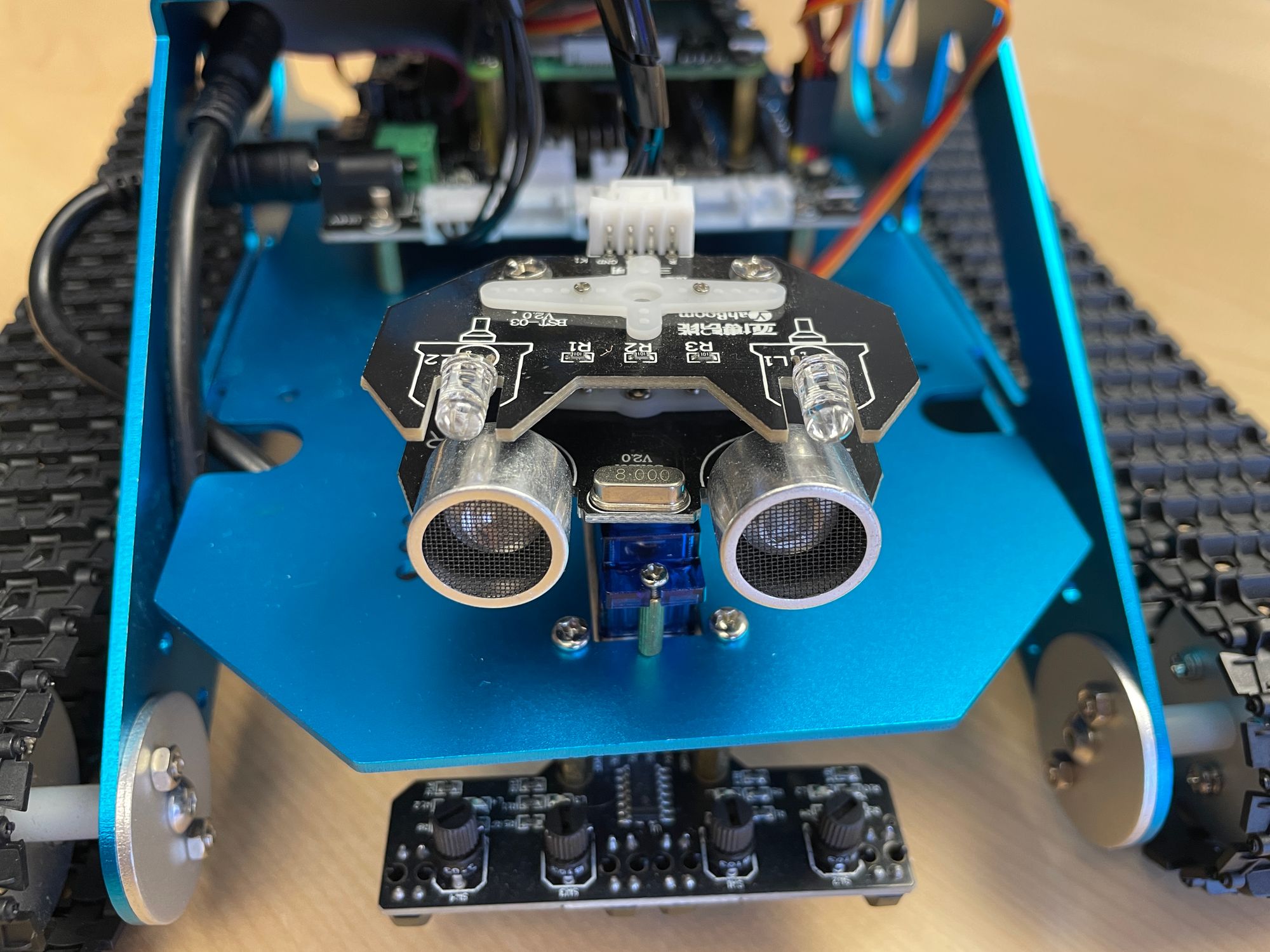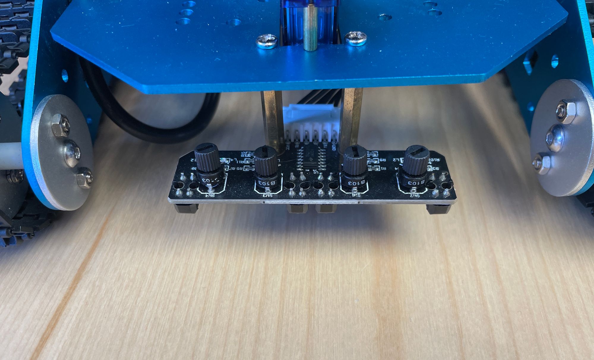 We also have 4 downward-facing contrast sensors mounted to the front of the tank. These go high or low based on whether a dark or light surface is beneath, allowing us to do things like track a black line path on a white background.