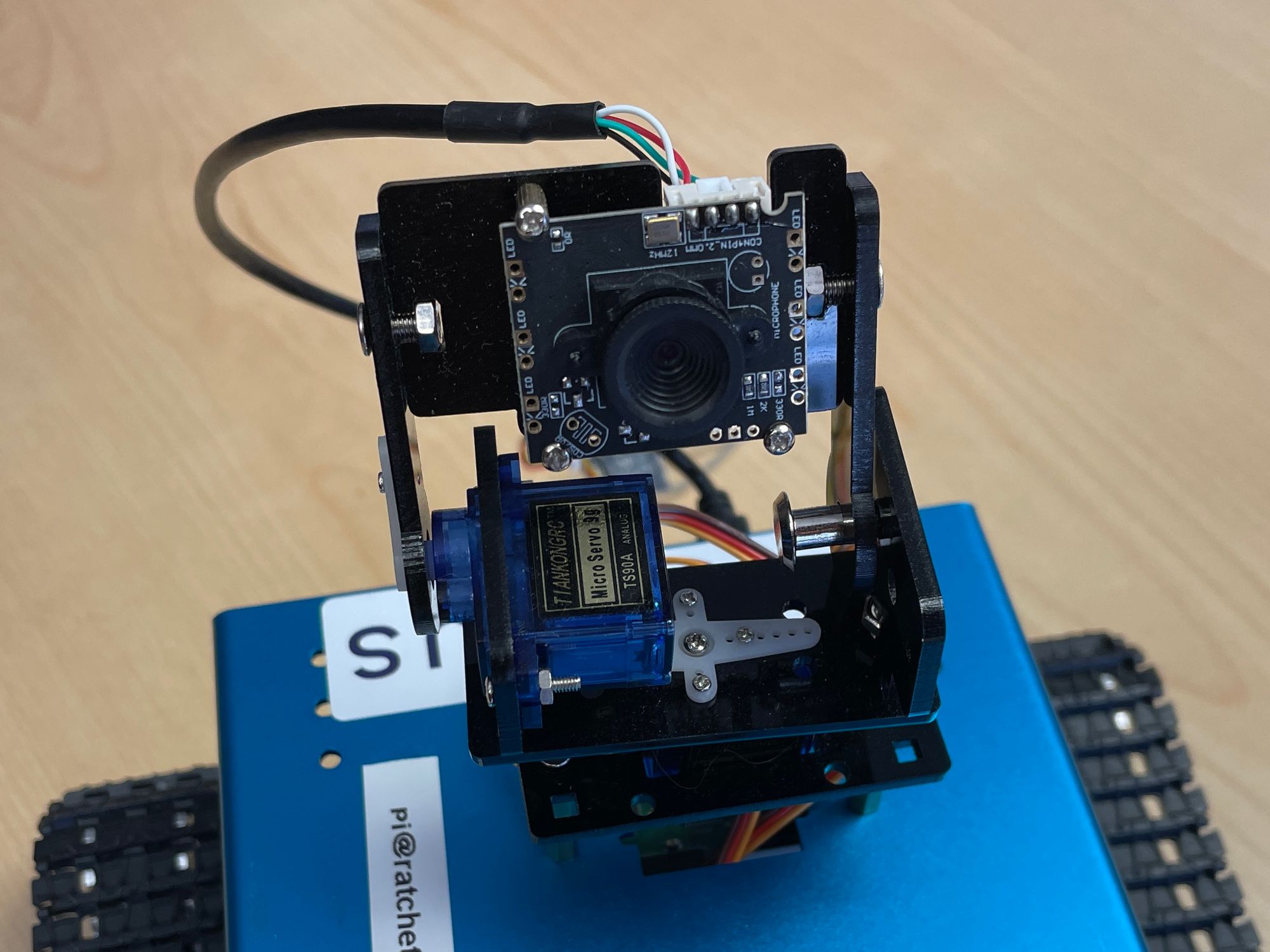 We can also articulate 3 different servo motors, two of which adjust yaw and pitch of a simple camera, and the third adjusting yaw of an ultrasonic range finder and some LEDs. We can turn on red, green, and blue lights within the LEDs, or combine them to create other colors.