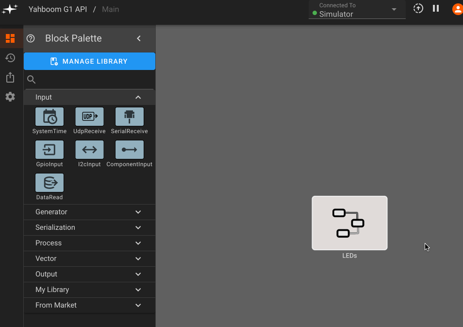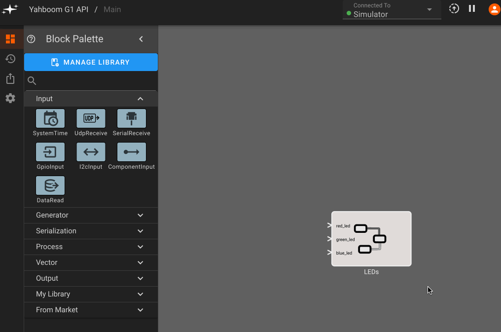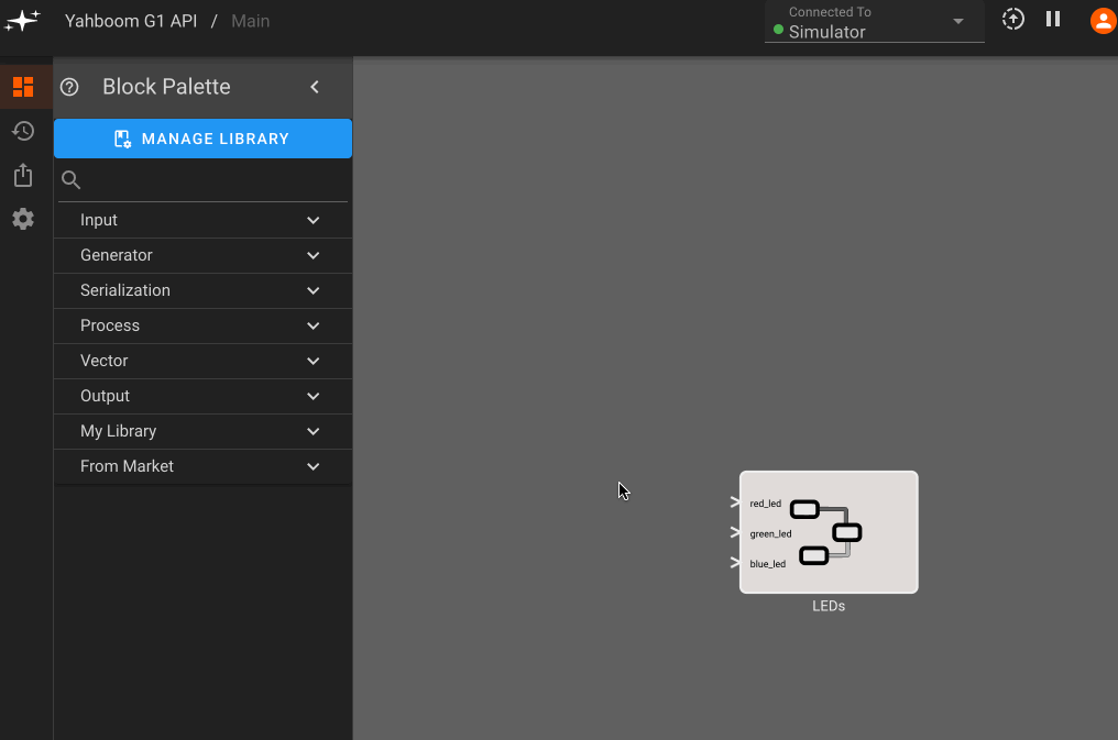 Okay, now we have a component to test! In earlier blog posts we showed how to sync a device with Pictorus cloud, so now we can connect to the Yahboom G1 and try turning on the LEDs! We also showed how to drive an LED with a squarewave signal, which we'll repeat here to blink the LEDs at different frequencies for each color: