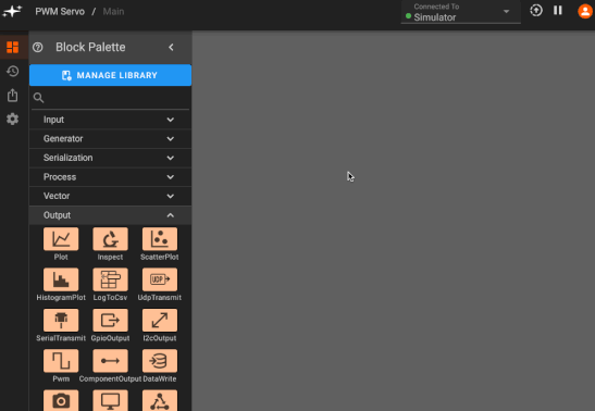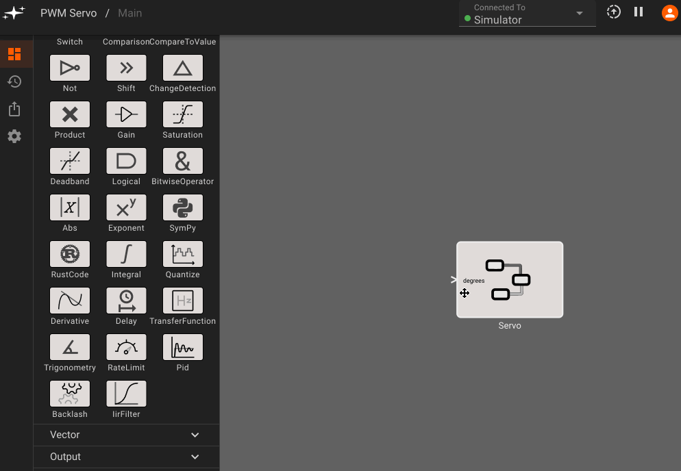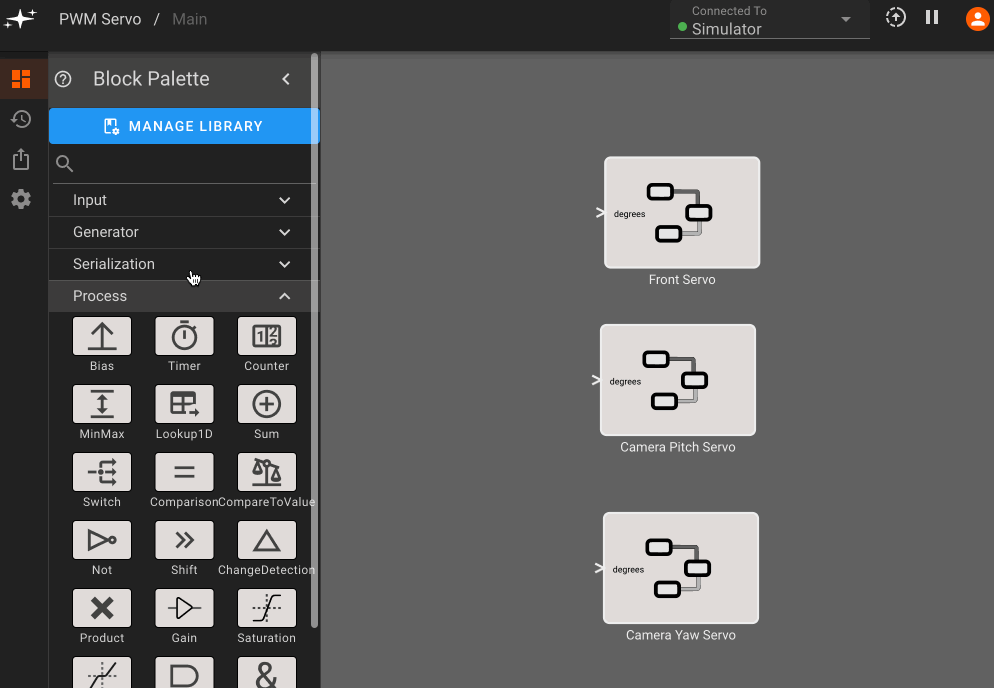 The PWM Output block helps us here. In addition to specifying the PWM pin number, we also need to send a constant command frequency (50Hz, specified by this device's manufacturer), and then allow users to command the desired angle, which our component will map to the PWM duty cycle. For these particular servos, the conversion from commanded degrees to duty cycle is (2.5 + degrees * 10 / 180)*0.01, which we can easily implement using a SymPy block, which allows calculations from simple pythonic syntax: