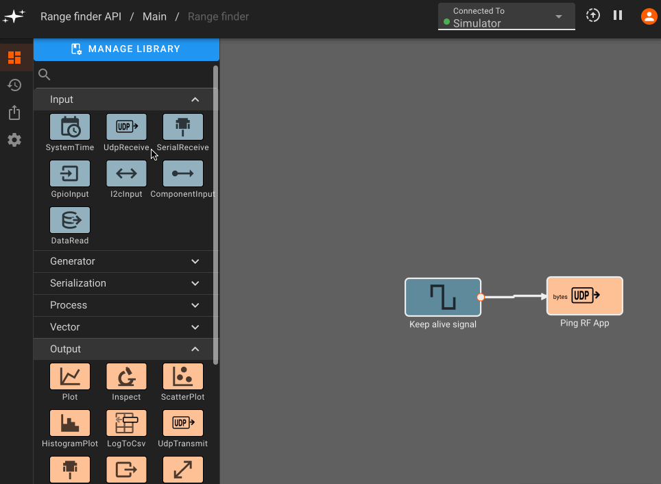 Now we can subscribe to the range estimate with a UDP Receive block. Data from sensors always arrives as bytes, so we introduce a Json Load block to deserialize, which by default simply attempts to convert bytes to a numeric value: