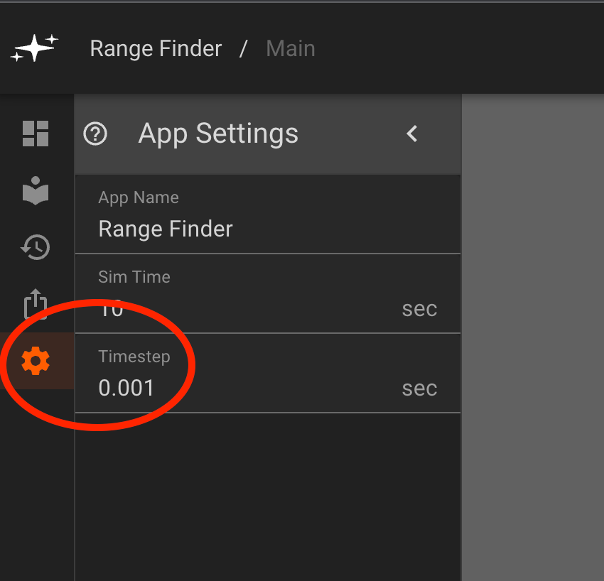 As always, we consult the device datasheet, which explains that we need to send a trigger pulse for at least 10ms, and advises a 60ms measurement cycle to listen for the echo pulse. So we need this app to run with an update interval of at least 10ms. For good measure, we'll start with an update rate of 1ms. We can configure this using the App Settings menu from the left panel, indicated with a gear icon. We set the timestep to 0.001s.