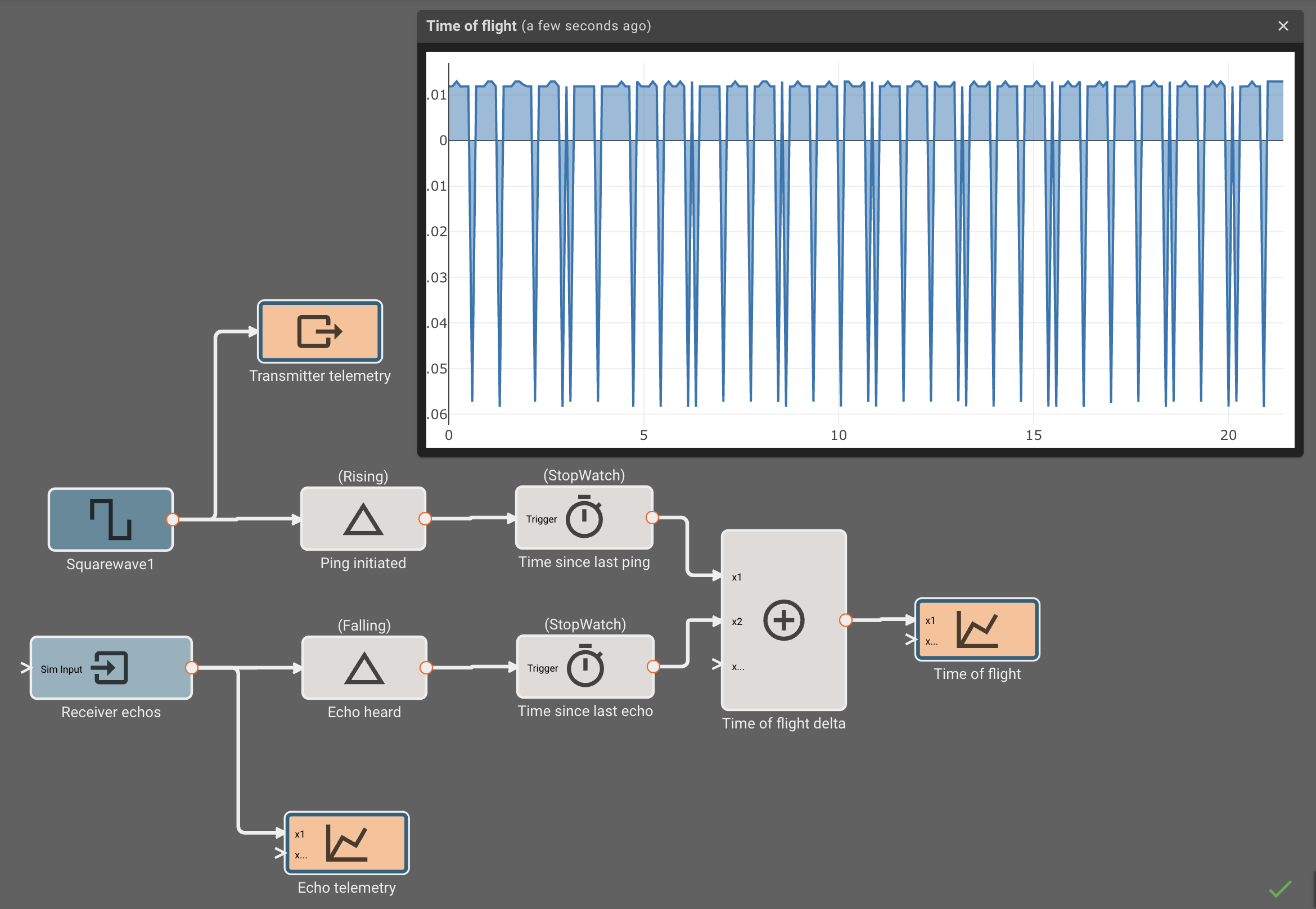 To do this, let's record the time between when we transmit a ping, and when the reflection is heard. We add a Timer block to our app, and configure it to stopwatch mode. This will track how much time has passed since its input was last true. Between the Squarewave generator and the Timer, we insert a ChangeDetection block, configured to emit true when the input signal from the Squarewave is rising.