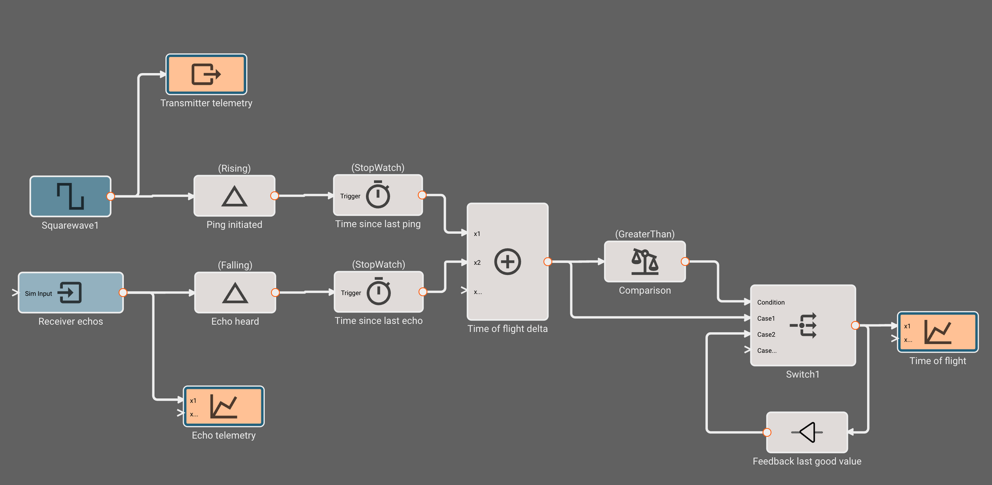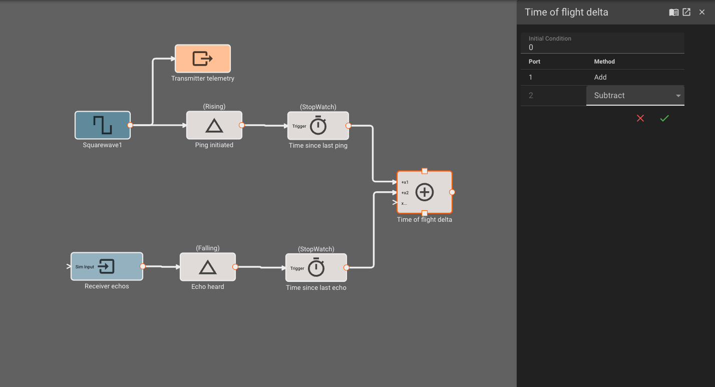 This sequence of blocks will now track the time since the beginning of the last transmit pulse. One simple way to estimate the echo time is to simply subtract this timer's value from a similar timer tracking falling echo signals (receiver is high when nothing heard, goes low when echo heard). We can replicate the timer sequence for the receiver, and connect them both to a Sum block, setting the second port to "Subtract" from the first.