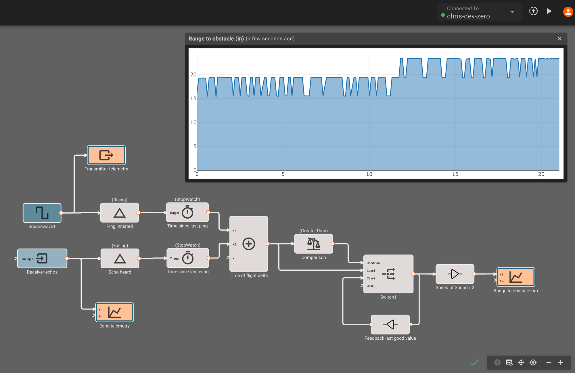 Ultrasonic rangefinders are everywhere in the robotics world. These devices emit acoustic pings outside our audible range to estimate short distances (within a few meters) from a hardware platform. In this post we'll demonstrate how to quickly connect to and get a range estimator up and running, with live telemetry, using Pictorus, which is currently a free software development platform in Open Beta. The component we build here will be available on the Pictorus public marketplace, so anyone can easily incorporate it into their own project.