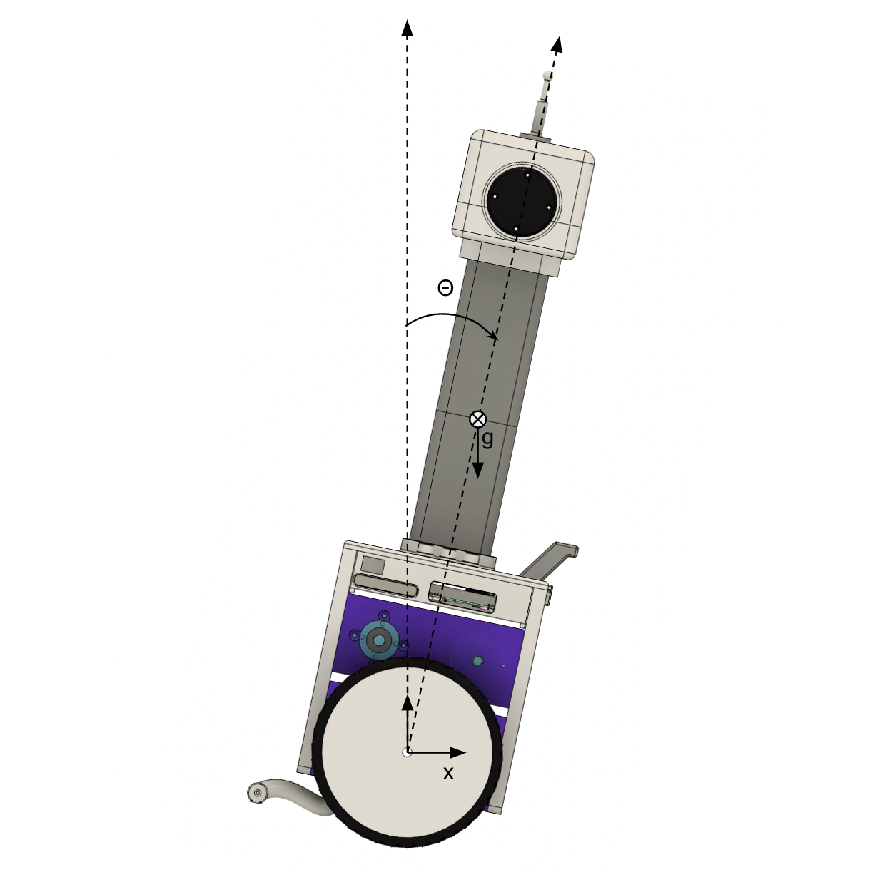 This setup is unstable, since any uncontrolled pitch will cause the robot to tip over. Our primary control goal is to minimize theta (stay upright). Additionally, we'd like to be able to command a velocity forward or backward using our FlySky RC from before. So our controller will need to carefully command pitch angle to speed up when we want to, but without tipping over.