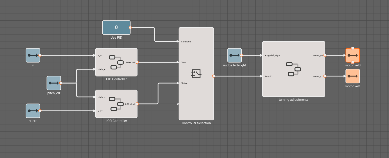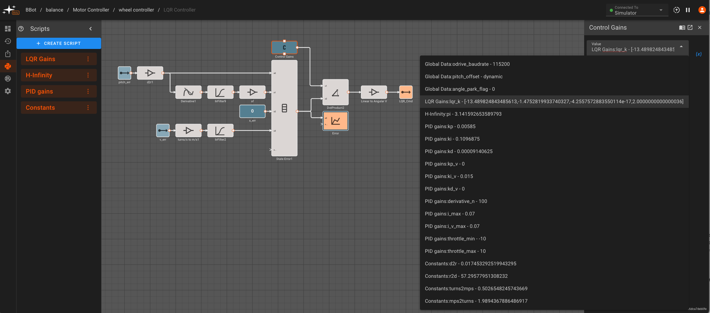 Furthermore, LQR lets us weigh different objectives relative to each other, so we can prioritize pitch angle (necessary to stay upright) over desired velocity. And since it understands how all of these control goals affect the magnitude of our control output, LQR also comes built in with a simple way to penalize control "effort". This means with a single variable we can make the entire control response more snappy or less snappy, which can have a big impact on power consumption and actuator lifetime.