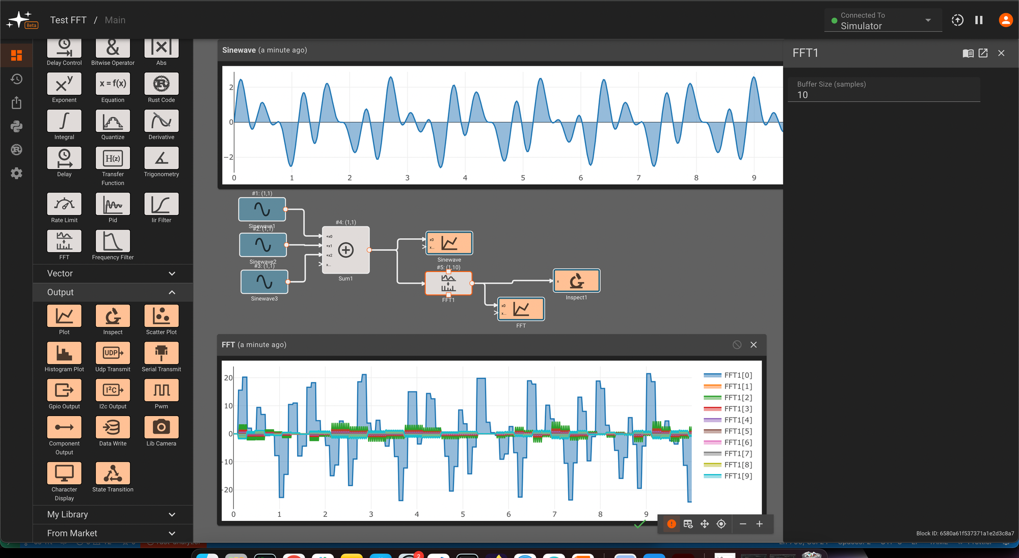 The FFT block implements the Discrete Fourier Transform via the computationally efficient Fast Fourier Transform algorithm, parsing a signal into its spectral components and allowing for advanced frequency analysis. This is particularly powerful when dealing with a noisy sensor measurement where multiple important frequencies are present, and the relative magnitude of each needs to be computed.