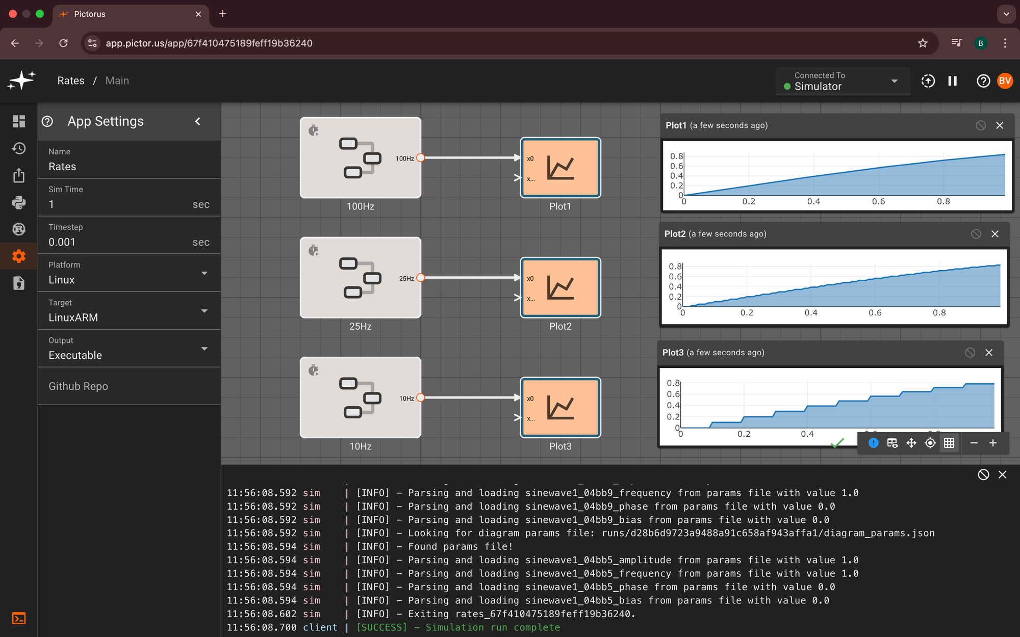 We're excited to share highlights from the first quarter of 2025, featuring several awesome updates that simplify your experience with hardware. We've rolled out analog-to-digital sensor support and its inverse, digital-to-analog. Pictorus now formally supports Functional Mockup Units (FMUs), allowing you to easily import existing plant simulations from Julia, Modelica or Simscape. With Atomic Update Rates, you get fine-grained control of execution timing, allowing different components to execute at discrete frequencies. Embedded targets now have native telemetry support. Finally, for clients dealing with the federal government, we've introduced GovCloud hosting to enable cloud storage of sensitive IP.