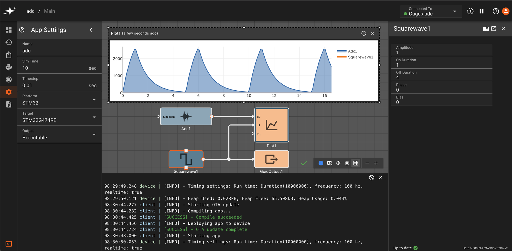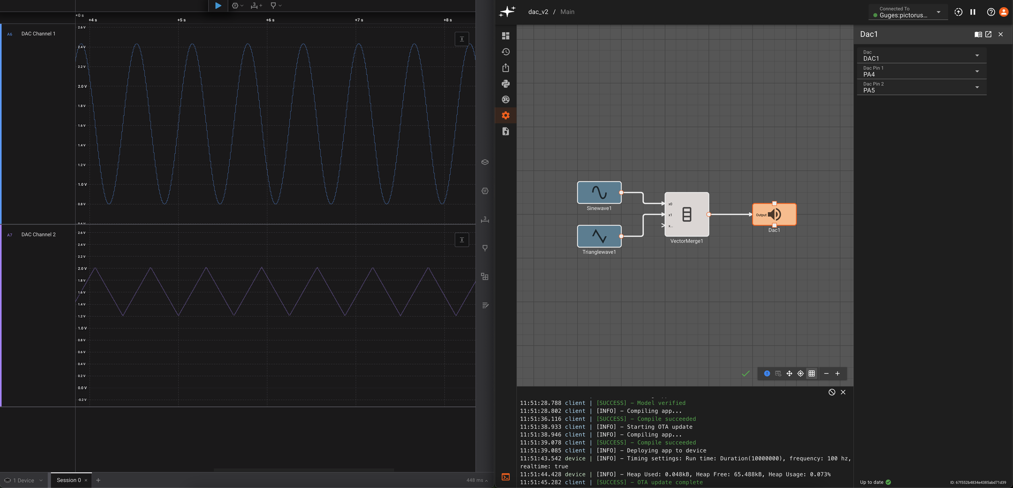 We've added a dedicated DAC block for STM32 boards, enabling you to generate precise analog output signals directly from your digital sources. Ideal for applications like waveform generation, motor control, and audio output, this feature further enhances the library of protocols making it easy to communicate with hardware.
